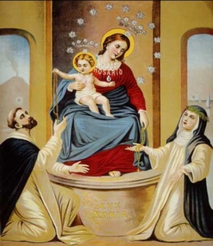 The word Rosary comes from the Latin "rosarium" meaning a wreath ofor chaplet of roses which was used to denote a collection of sayings and prayers, Prior to the Christian era noted cords and strings of stones had been used to keep track of repeated prayers and penitential acts. Among the early hermits, anchorites and monks a devotion to our Lady was prevalent Legend has it the St. lldephones' and later St. Dominic received directions concerning the recitation of the Rosary from Mary herself. The recitation of Hail Marys to be counted by the aid of Pater Nosters was common in the 12th century. Gradually to the prayers of praise, the Hail Mary, a second part, a prayer of petition the "holy Mary"--was added in varying forms. The prayer as we have today was given approved from the Romas Breviary of 1568.
