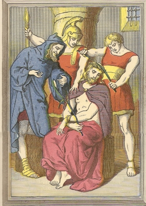 Then stripping him, they put a scarlet cloak about him. And platting a crown of thorns, they put it upon his head, and a reed in his right hand. And bowing the knee before him, they mocked him,, saying: Hail, king of the Jews. And spitting upon him, they took the reed, and struck his head. And after they mocked him, they took off the cloak from him, and put on him his own garments, and led him away to crucify him. (Matt 27: 28-31)