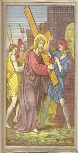 Jesus shed in the streets of Jerusalem, When He carried the Cross upon His sacred shoulders, deliver the souls in Purgatory and especially that soul which is richest in merits before Thee; that so in that throne of Glory which awaits it, it may magnify Thee and bless Thee forever. Amen. Our Father *** Hail Mary