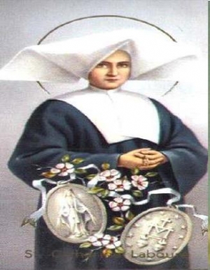 The devotion commonly known as that of the Miraculous Medal owes its origin to Zoe Labore, a member of the Daughters of Charity of St. Vincent de Paul, known in religion as Sister Catherine [Note: She was subsequently canonized], to whom the Blessed Virgin Mary appeared three separate times in the year 1830, at the motherhouse of the community at Paris. The first of these apparitions occurred 18 July, the second 27 November, and the third a short time later. On the second occasion, Sister Catherine records that the Blessed Virgin appeared as if standing on a globe, and bearing a globe in her hands. As if from rings set with precious stones dazzling rays of light were emitted from her fingers. These, she said, were symbols of the graces which would be bestowed on all who asked for them. Sister Catherine adds that around the figure appeared an oval frame bearing in golden letters the words "O Mary, conceived without sin, pray for us who have recourse to thee"; on the back appeared the letter M, surmounted by a cross, with a crossbar beneath it, and under all the Sacred Hearts of Jesus and Mary, the former surrounded by a crown of thorns, and the latter pierced by a sword.