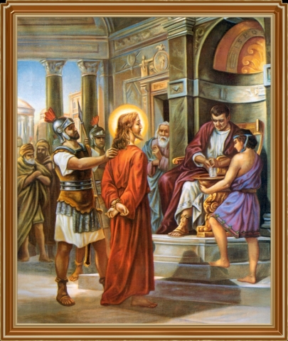 Leaving the house of Caiphas, where He had been blasphemed and the House of Herod, where He had been mocked, Jesus is dragged before Pilate, His back torn with scourges, His head crowned with thorns: and He who on the last day will judge the living and the dead, is Himself condemned to a disgraceful death.
