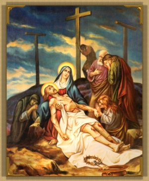 The multitude have left the heights of Calvary, and none remain save the beloved disciple and the holy women, who, at the foot of the cross, are striving to stem the grief of Christ's inconsolable Mother. Joseph of Arimathea and Nicodemus take down the body of her Divine Son from the cross and deposit it in her arms