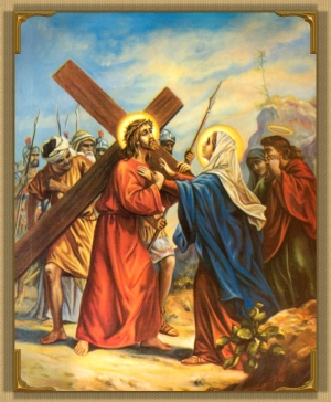 Still burden with His cross, and wounded yet more by His fall Jesus proceeds on His way. He is met by His Mother. What a meeting must that have been ! What a sword of anguish must have pierced that Mother's bosom ! What must have been the compassion of that Son for His holy Mother !