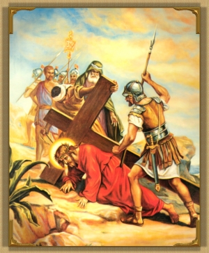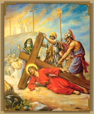 Bowed down under the weight of the cross. Jesus slowly sets forth on the way to Calvary, amidst the mockeries and insults of the crowd. His agony in the garden has exhausted His body; He is sore with blows and wounds' His strength fails Him; He falls to the ground under the cross.